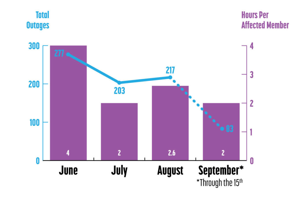 June had the highest number of outages and the longest average hours per affected member, while July and August saw moderate levels. Through the 15th, September is on track to have the fewest outages and the shortest outage times.