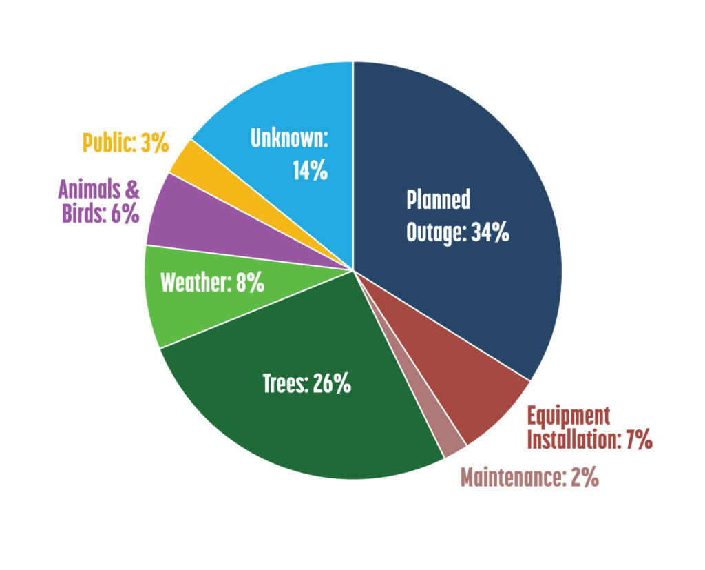 Planned outages, at 34 percent, are necessary interruptions that let crews safely upgrade and strengthen the system. Trees caused 26 percent of outages, a number that highlights the importance of our Vegetation Management program.