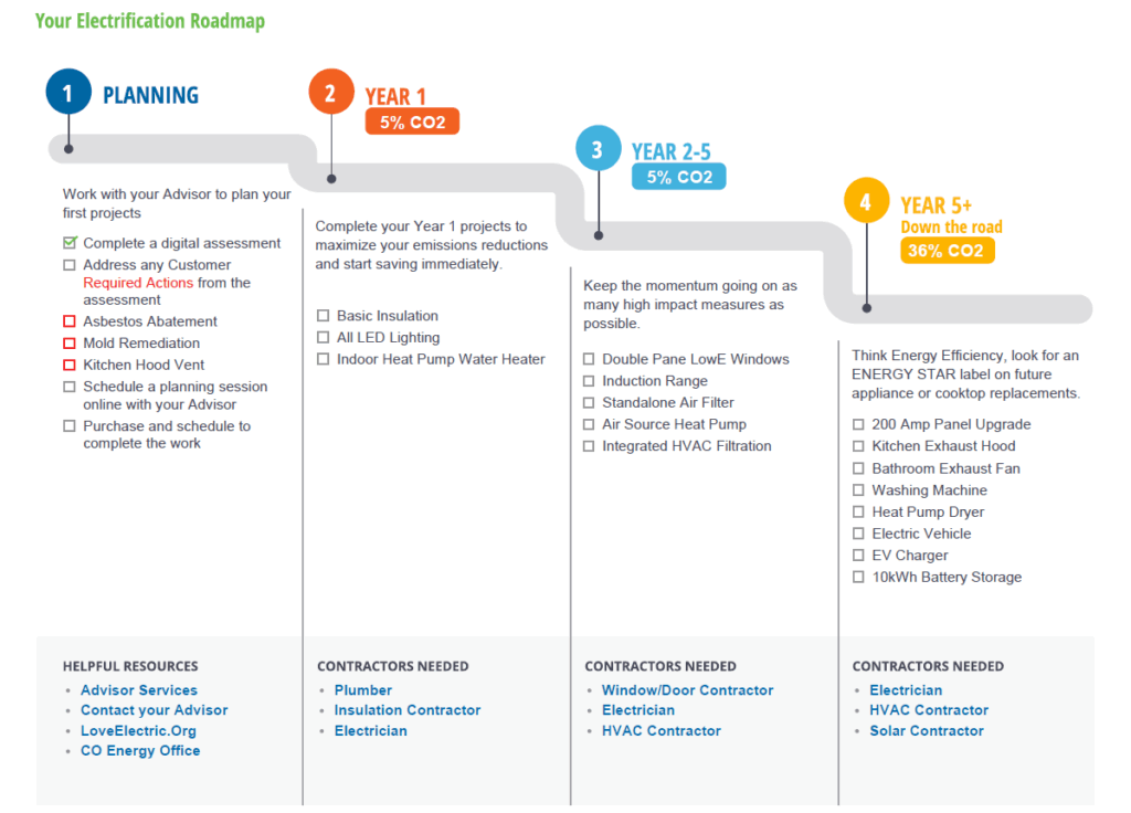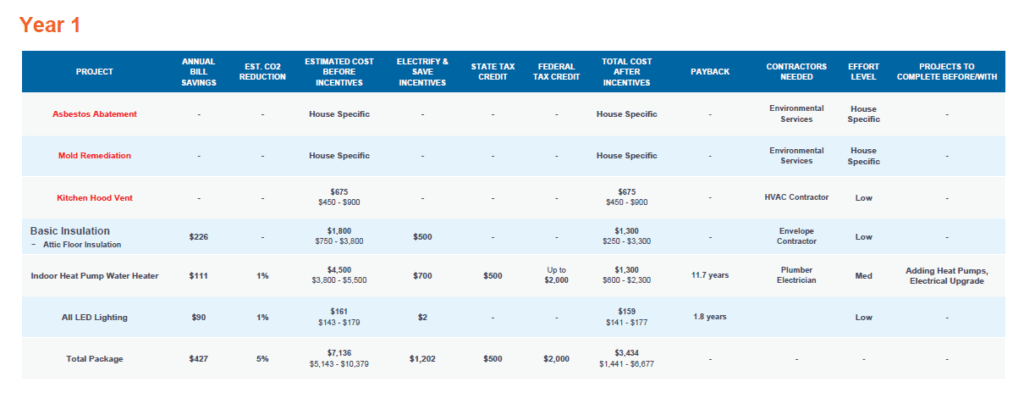 Once an assessment is completed, Zero Homes can help develop a multi-year plan specific to your home and energy efficiency goals, outlining recommended steps and their expected impact along the way: